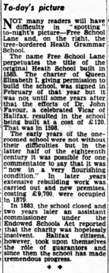 Originally founded in 1585, and called The Free Grammar School of Queen Elizabeth at Heath, and later known more simply as Heath Grammar School. In 1985, it merged with the Crossley and Porter School to form the Crossley Heath School. After the merger, the former Heath building initially housed the combined sixth forms of the two schools. After a couple of years Free School Lane site was passed over to the local authority to become a training centre. The building is listed.