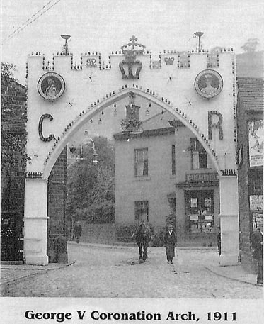 A triumphal arch spanning the junction of New Road and Bridge Gate, Hebden Bridge to celebrate the Coronation of George V