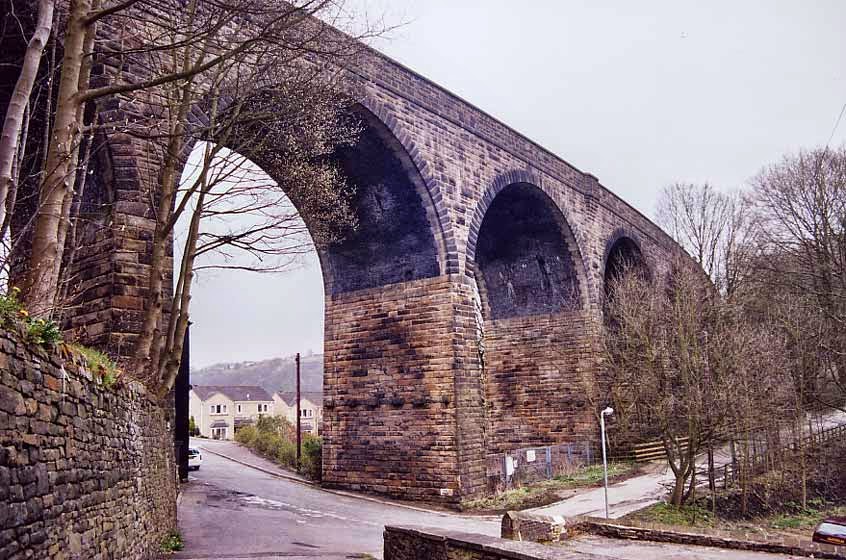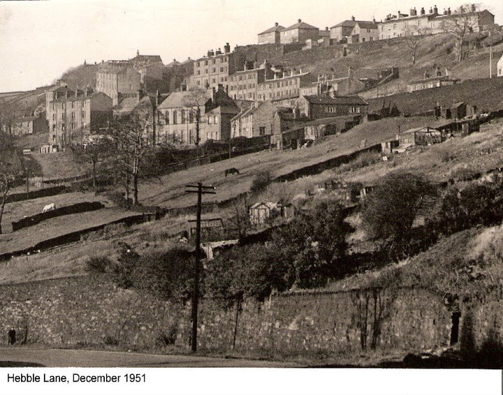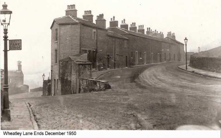 The building at the bottom of the hill, with the prominent chimney stack, was Fred Akroyd's fish and chip shop. Also, nearby was a butchers shop and a corner shop selling groceries.