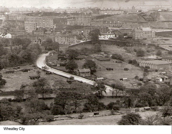 Birks Hall with it's mill, dam and Hebble Brook. To the left is Shroggs Road and you can also see the houses on the top right which are off Pellon Lane. Dean Clough and Halifax cooling towers are in the distance along with Beacon Hill.