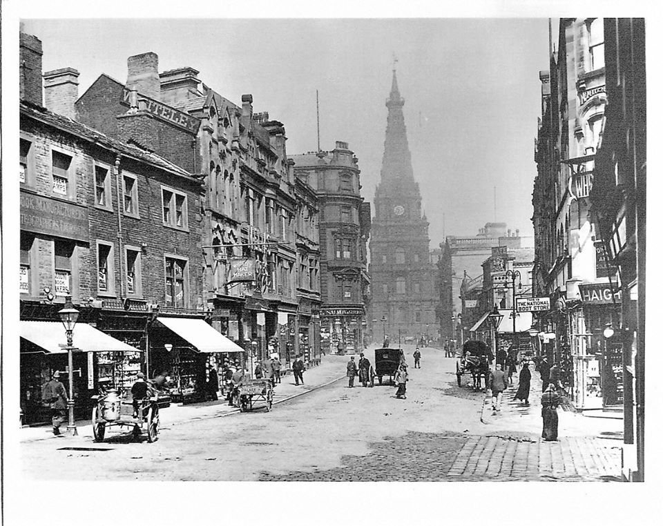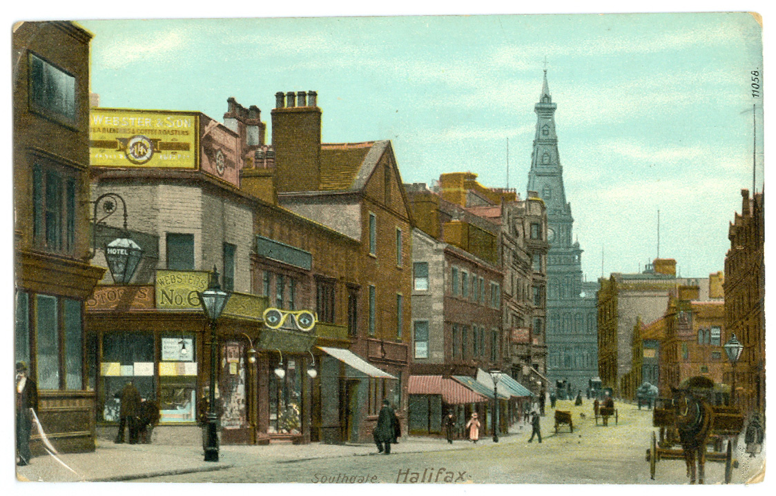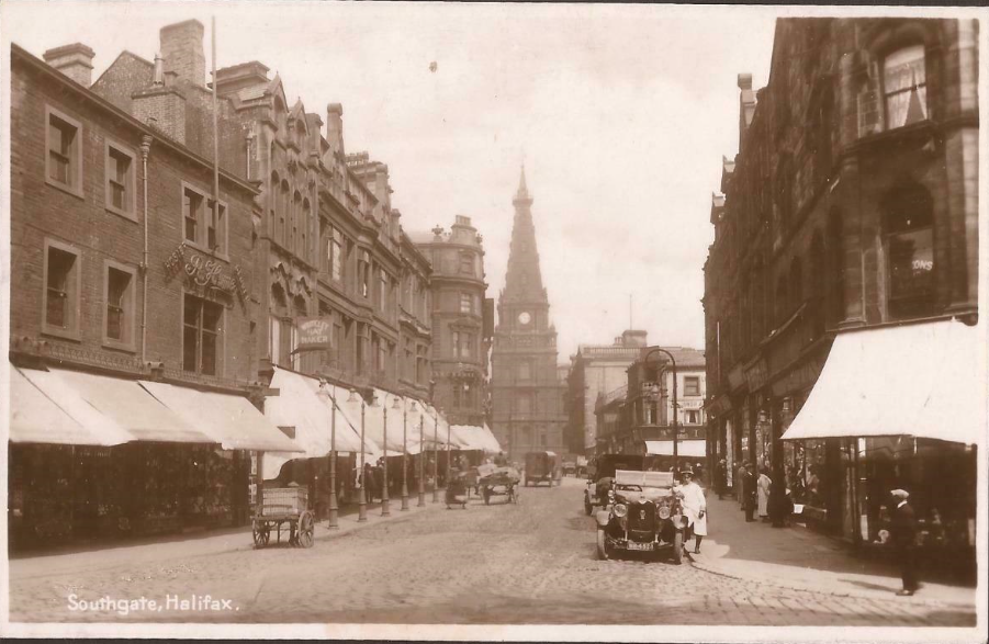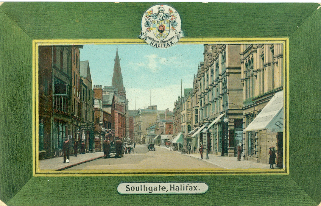 Photograph of Southgate and Ward's End, Halifax in 1892. On the left is the top of Albion Street and beyond is Westgate. The premises between are those of George Watson, plumber; Lewis Bagot Waite, hairdresser (and as usual umbrella repairer); the White Horse Inn (Joshua Sutcliffe licensee). Next is the side of a newer building numbered in Westgate and occupied by George Walker, plumber.