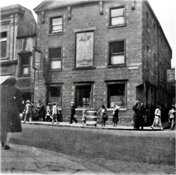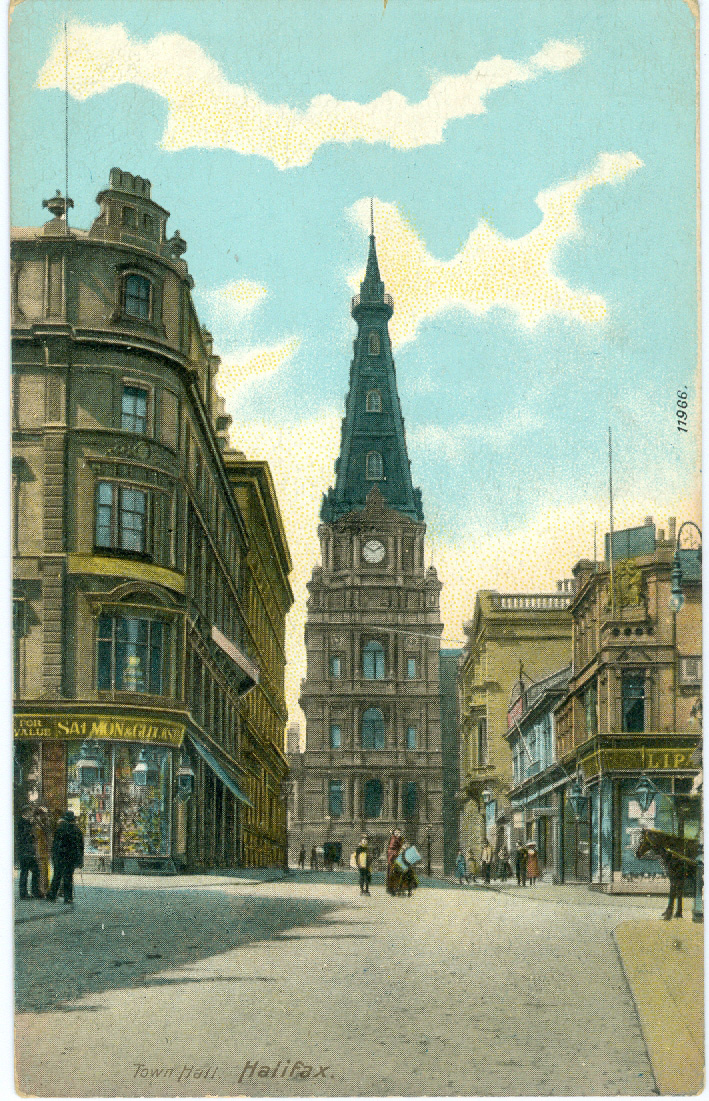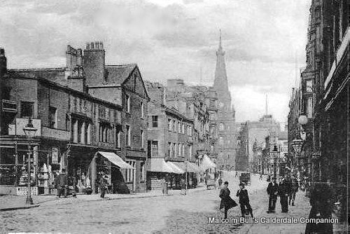 The first illuminated clock, seen above, was erected in August, 1846 by Mr Alfred Wilson, Hatter in Corn Market and became a prominent place of note, to arrange to meet at. It was first lighted on the 14th August, the day on which the Rejoicings for the Repeal of the Corn Laws took place in Halifax.