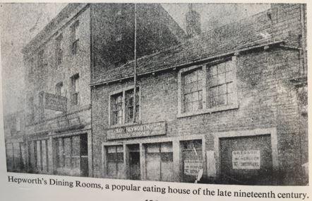 Southgate looking north before 1890. Immediate right is entrance to Westgate. Just beyond this is the White Horse Inn. Then came a barbers and then an umbrella hospital Albion street, then the Greyhound Inn which was demolished in 1892 to make way for the Borough Market.