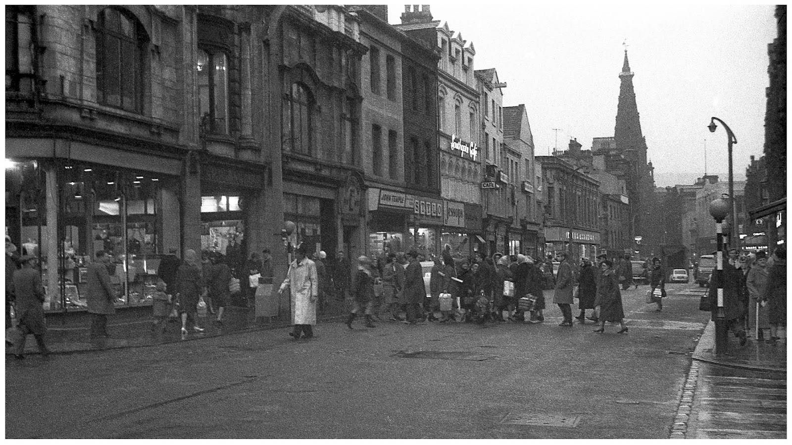 On the left beyond the greyhound Inn, the White Lion, the Theatre Royal (with pair of lamps on the footway), next what was known as Hutchinson's Warehouse, to the Royal Oak Hotel. which is the far low building with a jutting lamp.